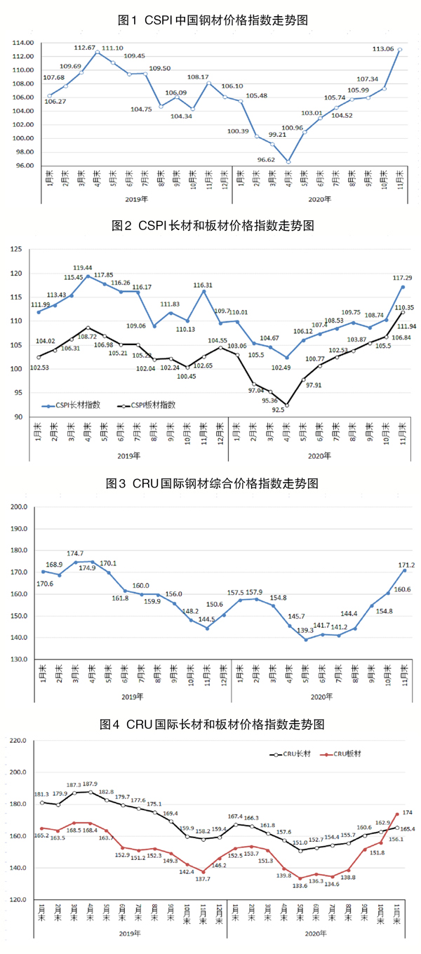 據鋼協監測,11月末,中國鋼材價格指數(CSPI)為113.06點,環比上升5.72點,升幅為5.33%,較10月份擴大4.06個百分點;與去年同期相比上升4.89點,升幅為4.52%。(見圖1)