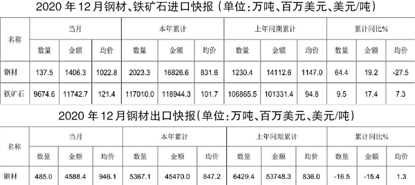 根據海關統計快訊數據,2020年12月份,我國進口鋼材137.5萬噸,環比減少47.9萬噸,下降25.8%;均價為1022.8 美元/噸,環比增加 152.3美元/噸,增長17.5%。2020年1月~12月份,累計進口鋼材2023.3萬噸,同比增加792.9萬噸,增長64.4%。