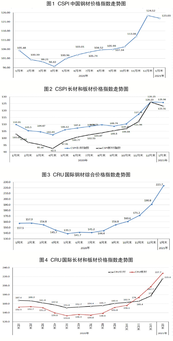 1月份,由於天氣轉冷,加上新一輪的疫情防控措施和臨近春節假期等因素影響,國內市場鋼材需求強度有所減弱。1月份,中國製造業PMI(采購經理指數)為51.3%,環比回落0.6個百分點,但連續11個月位於臨界點以上;CPI(消費者物價指數)同比下降0.3% 環比上漲1%;PPI(生產價格指數)同比上漲0.3% 環比上漲1%。1月末,廣義貨幣(M2)餘額同比增長9.4%,增速比2020年12月末低0.7個百分點;狹義貨幣(M1)餘額同比增長14.7%,增速比2020年12月末高6.1個百分點;流通中貨幣(M0)餘額同比下降3.9%。受鋼材市場需求強度減弱影響,1月份鋼材價格小幅下降。
