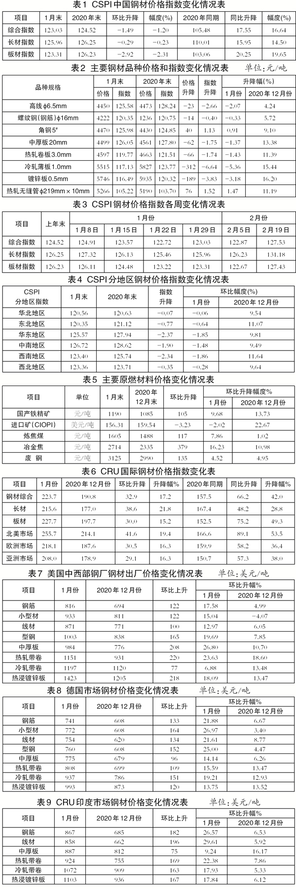 1月份,CRU亞洲鋼材價格指數為208.0點,環比上升29.1點,升幅為16.3%;日本製造業PMI為49.8%,環比下降0.2個百分點;韓國製造業PMI為53.2%,環比上升0.3個百分點;中國製造業PMI為51.3%,較上月小幅下降0.6個百分點。本月印度市場主要鋼材品種價格均繼續上升。(見表9)