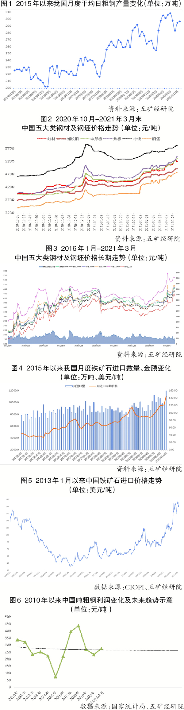 在前兩個月的全國粗鋼產量中,河北、江蘇、山東3省分別以4033.35萬噸、2029.07萬噸、1319.01萬噸排名前3位,粗鋼總產量占全國的近43%,這也是近期在唐山提出嚴格環保限產後江蘇省相應提出限產的重要原因之一。同期,我國鋼材產量為20953萬噸,同比增長23.6%。經計算,2021年1月~2月份我國累計日產粗鋼296.6萬噸,較2020年同期增加了近40萬噸。但是,2021年1月~2月份按同期黑色金屬冶煉和壓延加工業行業利潤計算的粗鋼利潤僅為275元/噸,與2019、2020年全年噸粗鋼利潤處於同一水平。
