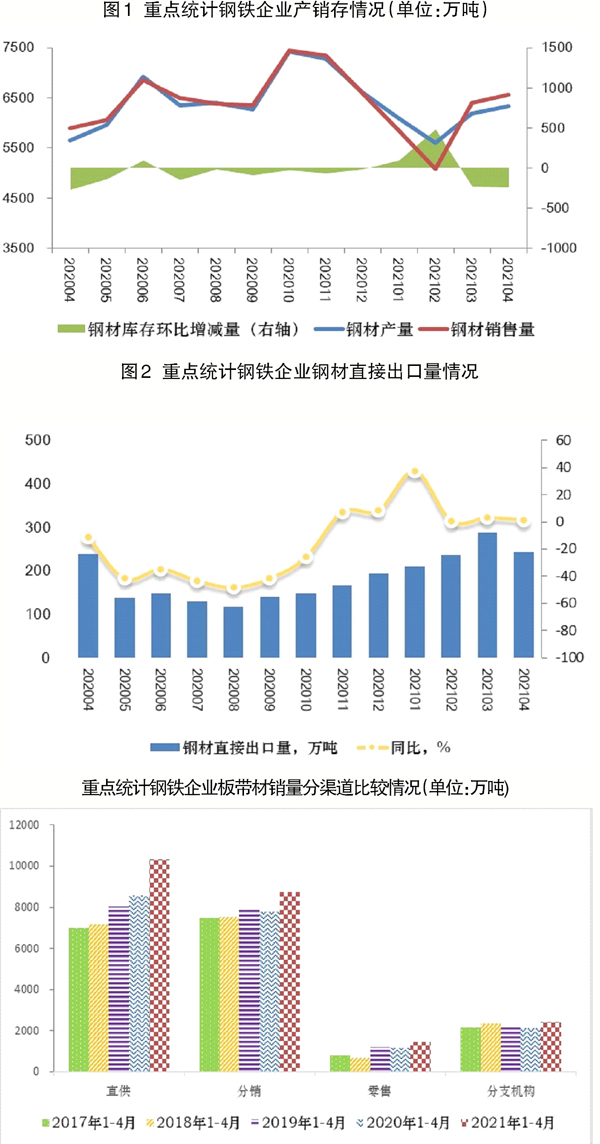 分銷售渠道看,1月~4月yue份fen,重zhong點dian統tong計ji鋼gang鐵tie企qi業ye同tong去qu年nian同tong期qi相xiang比bi,鋼gang材cai直zhi供gong銷xiao量liang增zeng長chang幅fu度du較jiao大da。其qi中zhong板ban帶dai材cai直zhi供gong銷xiao量liang大da幅fu上shang升sheng,且qie上shang升sheng幅fu度du大da於yu整zheng個ge鋼gang材cai直zhi供gong銷xiao量liang的de上shang升sheng幅fu度du,表biao明ming重zhong點dian統tong計ji鋼gang鐵tie企qi業ye加jia大da了le對dui板ban帶dai材cai用yong戶hu的de服fu務wu力li度du,進jin一yi步bu擴kuo大da了le板ban帶dai材cai直zhi供gong渠qu道dao的de占zhan比bi。