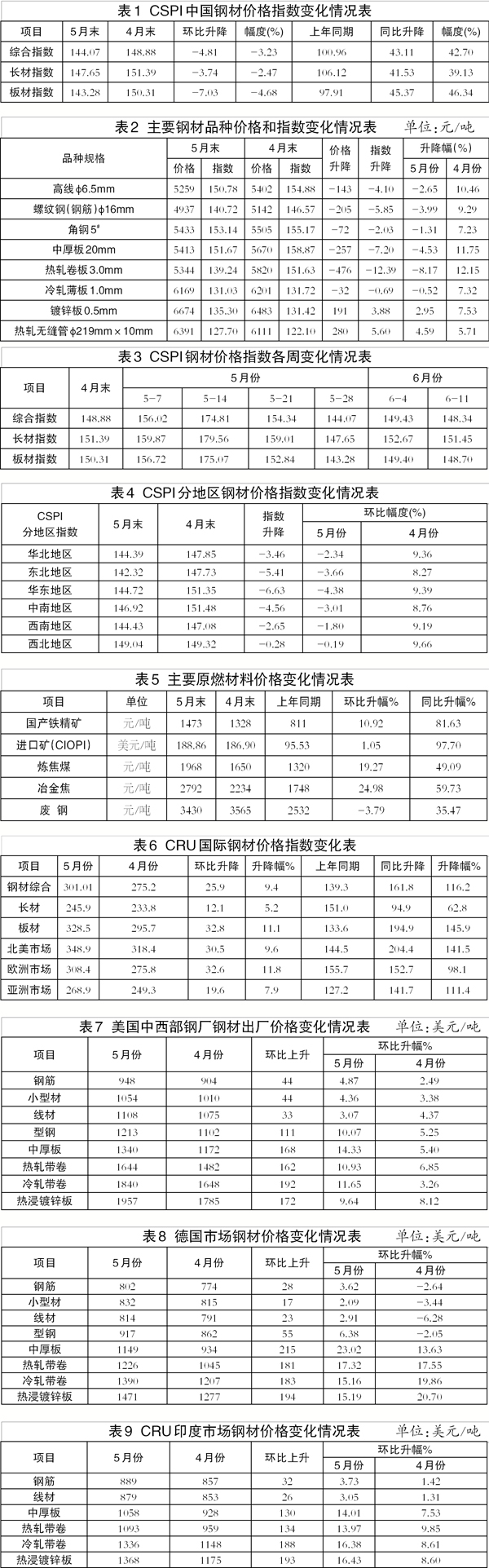 5月末,CSPI長材指數為147.65點,環比下降3.74點,降幅為2.47%;CSPI板材指數為143.28點,環比下降7.03點,降幅為4.68%,降幅大於長材2.21個百分點。(見圖2、表1)