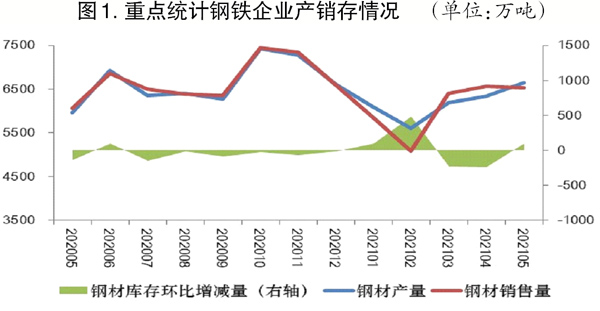 據營銷月報統計(剔除了因營銷統計企業數量增減對合計鋼材產量、鋼材銷量增減的影響),5月份,重點統計鋼鐵企業生產鋼材6644.14萬噸,比去年同期增長11.54%,鋼材日產水平為214.33萬噸,日產環比上升1.49%;銷售鋼材6536.44萬噸,比去年同期上升7.89%,鋼材日銷水平為210.85萬噸,日銷環比下降3.66%,其中國內銷售鋼材6370.51萬噸、比去年同期上升7.59%,直接出口鋼材165.93萬噸、比去年同期上升21.10%;鋼材產銷率98.38%,環比下降5.27個百分點。上述統計數據表明:重點統計鋼鐵企業5月份鋼材生產、銷售同比增長,說明鋼材市場明顯好於去年疫情期間水平。受下遊行業用鋼需求減弱、取消部分鋼鐵產品出口退稅政策等因素的影響,5月份鋼材產銷率環比下降,鋼材直接出口量環比下降。