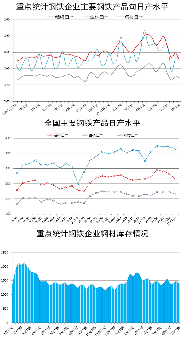 7月下旬,重點統計鋼鐵企業共生產粗鋼2317.15萬噸、生鐵2071.03萬噸、鋼材2327.65萬噸。其中,粗鋼日產210.65萬噸,環比下降3.97%,同比下降3.03%;生鐵日產188.28萬噸,環比下降1.37%,同比下降2.43%;鋼材日產211.60萬噸,環比下降0.51%,同比下降2.93%。這是今年初以來我國粗鋼旬度日均產量首次實現同比下降。