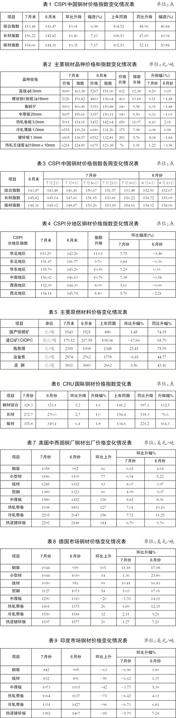 據鋼協監測,7月末,中國鋼材價格指數(CSPI)升至153.48點,比6月末上升10.01點,升幅為6.98%,升幅較6月份擴大7.39個百分點;與去年同期相比上升48.96點,升幅為46.84%。(見圖1)