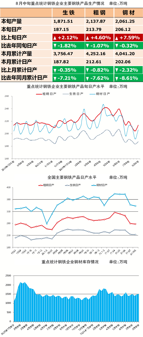 8月中旬,重點統計鋼鐵企業共生產粗鋼2137.87萬噸、生鐵1871.51萬噸、鋼材2061.25萬噸。其中,粗鋼日產213.79萬噸,環比增長4.60%、同比下降1.07%;生鐵日產187.15萬噸,環比增長2.12%、同比下降1.82%;鋼材日產206.12萬噸,環比增長7.59%、同比下降0.32%。