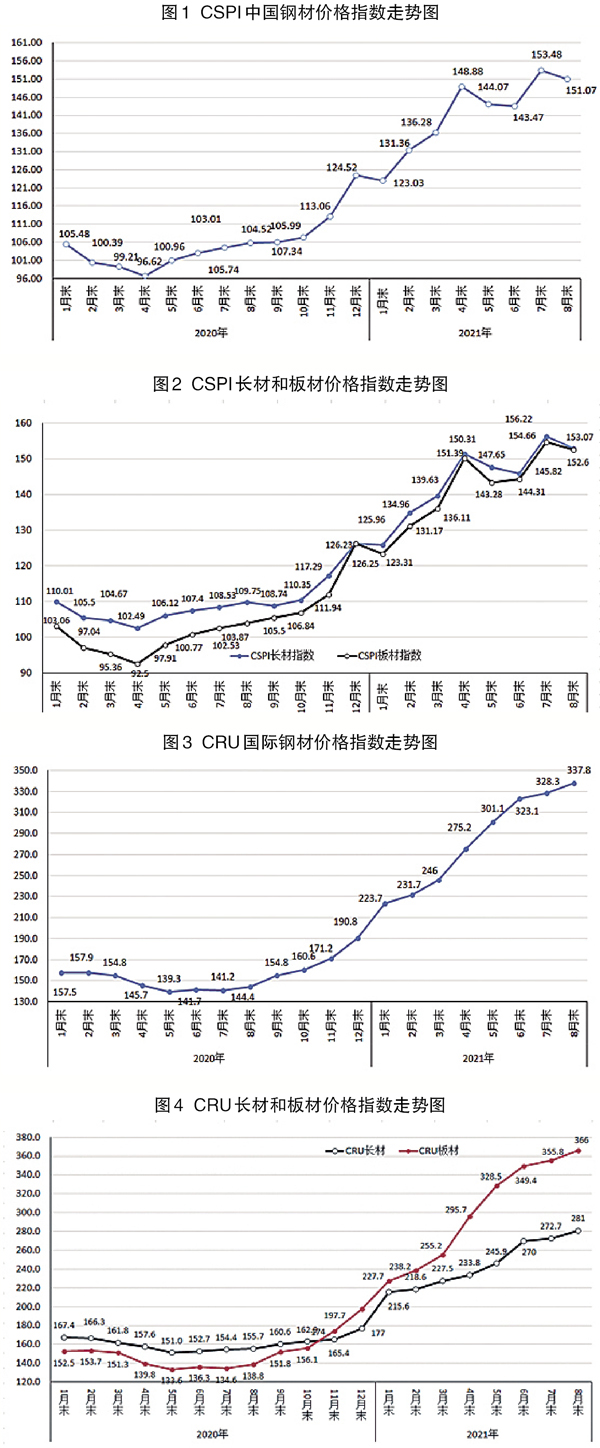 8月份,國際鋼材價格指數(CRU)為337.8點,環比上升9.5點,升幅為2.9%;同比上升193.4點,升幅為133.9%。(見圖3、表6)
