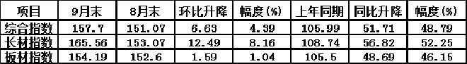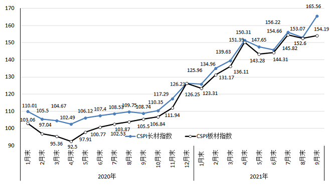 9月末,CSPI長材指數為165.56點,環比上升12.49點,升幅為8.16%;CSPI板材指數為154.19點,環比上升1.59點,升幅為1.04%;長材價格升幅比板材高7.12個百分點。與上年同期相比,長材、板材指數分別上升56.82點和48.69點,升幅分別為52.25%和46.15%。(見下圖、表)