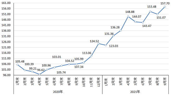 據鋼鐵協會監測,9月末,中國鋼材價格指數(CSPI)為157.70點,比8月末上升6.63點,升幅為4.39%,環比由降轉升;與上年同期相比上升51.71點,升幅為48.79%。(見下圖)