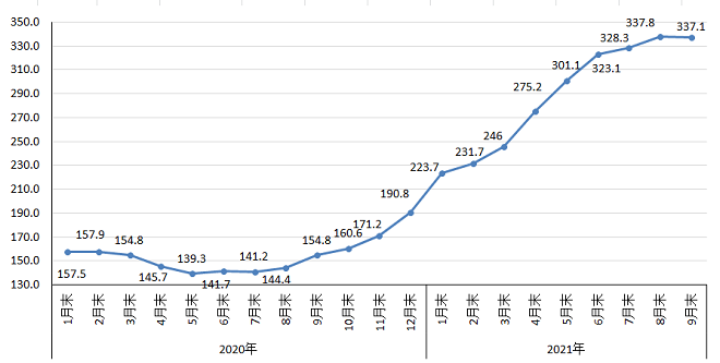 9月份,國際鋼材價格指數(CRU)為337.1點,環比下降0.7點,降幅為0.2%,環比由升轉降;與上年同期相比上升182.3點,升幅為117.8%。(見下圖、表)