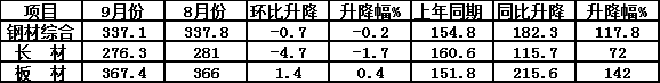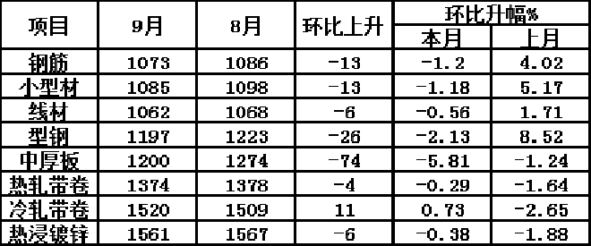 9月份,受“雙控”等環保措施影響,國內鋼鐵產量繼續下降,鋼材市場偏緊預期有所上升,鋼材價格由降轉升。進入10月份以來,鋼材價繼續呈小幅上升走勢。