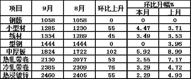 9月末,在鋼鐵協會監測的八大鋼材品種中,除冷軋薄板和鍍鋅板價格分別小幅下降3元/噸和21元/噸外,其它品種價格均由降轉升。其中,高線、螺紋鋼、熱軋無縫管回升幅度較大,環比分別上升478元/噸、541元/噸和309元/噸;角鋼、中厚板和熱軋卷板升幅相對較小,環比分別上升128元/噸、88元/噸和102元/噸。(見下表)