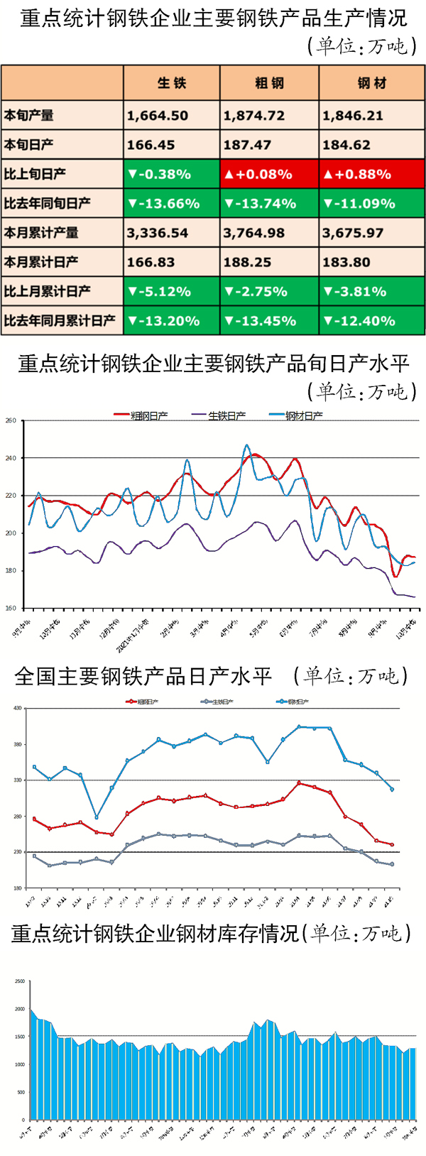 據10月中旬旬報統計,10月上中旬重點統計鋼鐵企業累計粗鋼日產188.25萬噸,環比下降2.75%,同比下降13.45%;生鐵日產166.83萬噸,環比下降5.12%,同比下降13.20%;鋼材日產183.80萬噸,環比下降3.81%,同比下降12.40%。