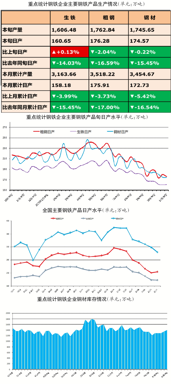 11月中旬,重點統計鋼鐵企業共生產粗鋼1762.84萬噸、生鐵1606.48萬噸、鋼材1745.65萬噸。其中,粗鋼日產176.28萬噸,環比下降2.04%;生鐵日產160.65萬噸,環比增長0.13%;鋼材日產174.57萬噸,環比下降0.22%。
