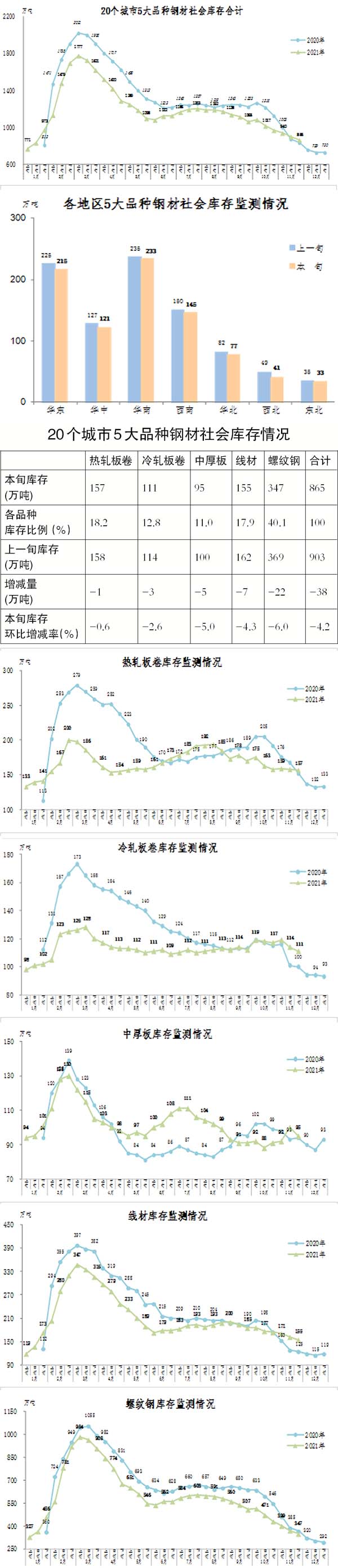 11月下旬,20個城市5大品種鋼材社會庫存865萬噸,環比減少38萬噸,下降4.2%,庫存連續下降;比10月下旬減少104萬噸,下降10.7%;比年初增加135萬噸,上升18.5%;同比增加28萬噸,上升3.3%。