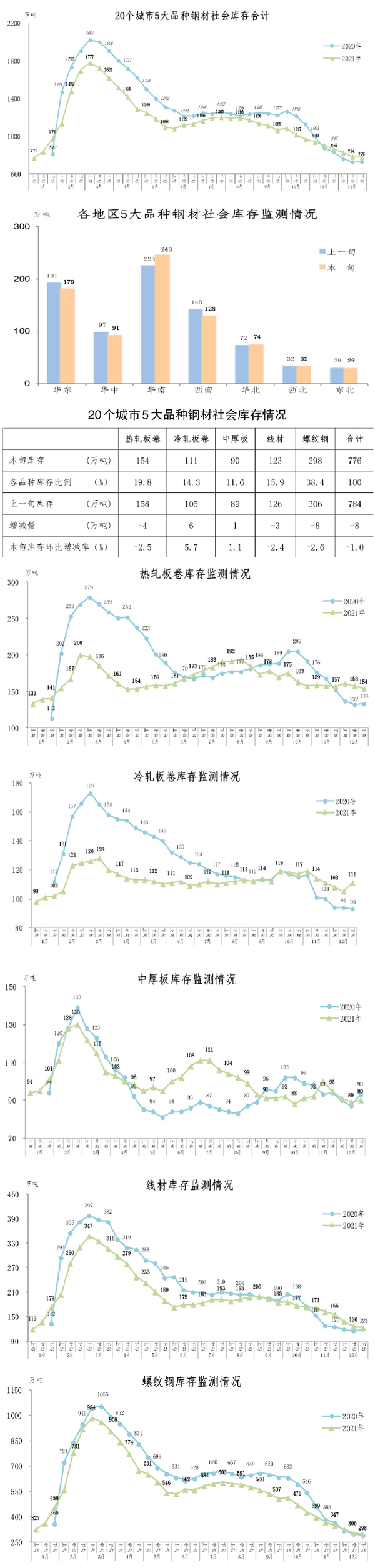 2021年12月下旬,20個城市5大品種鋼材社會庫存為776萬噸,環比減少8萬噸,下降1.0%,庫存降幅較前期有所收窄;比2021年11月下旬減少89萬噸,下降10.3%;比2021年初增加46萬噸,上升6.3%。