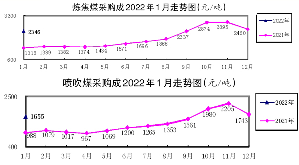1月份,對標企業噴吹煤加權平均折算成幹基的采購成本為1654.97元/噸,環比下降88.44元/噸,降幅為5.07%;同比升高666.55元/噸,升幅為67.44%。