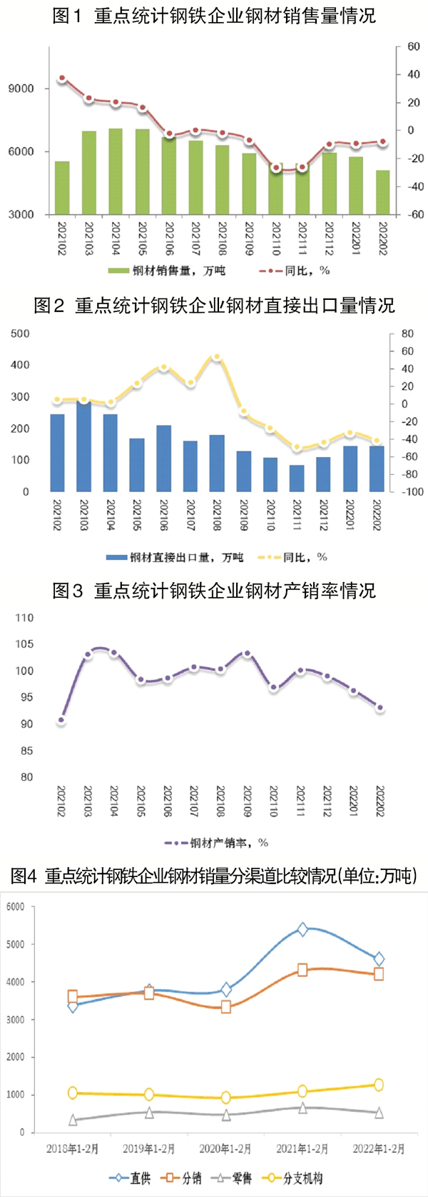 1月~2月份,重點統計鋼鐵企業鋼材直供銷量同比下降14.75%,占鋼材國內銷售量的比例為43.37%;鋼材分銷銷量同比下降2.35%,占鋼材國內銷售量的比例為39.70%;鋼材零售銷量同比下降18.87%,占鋼材國內銷售量的比例為5.02%;通過分支機構銷鋼材量同比上升16.23%,占鋼材國內銷售量的比例為11.91%。