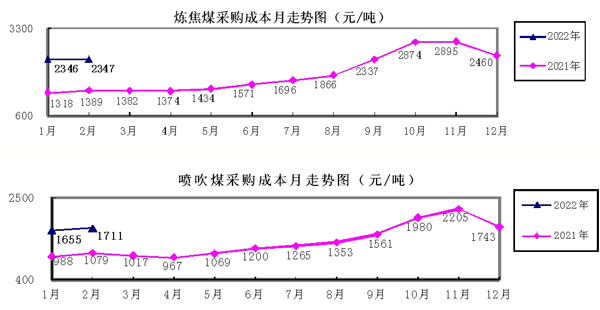 2月份,對標企業煉焦煤加權平均折算成幹基的采購成本為2346.97元/噸,環比升高0.59元/噸,升幅為0.02%。1月~2月份,累計平均折算成幹基的采購成本為2354.54元/噸,同比升高1000.91元/噸,升幅為73.94%。