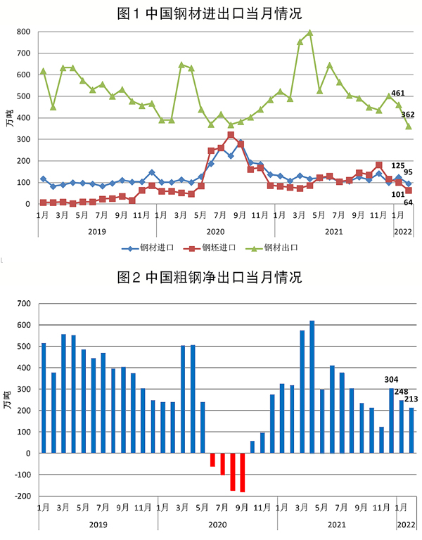 1月~2月份,我國累計出口鋼材823.4萬噸,同比減少18.8%。同期,累計進口鋼材220.7萬噸,同比減少7.9%;累計進口鋼坯及鋼錠166萬噸,同比增加2.6%。今年前2個月,我國粗鋼淨出口460.9萬噸,同比減少182.3萬噸。