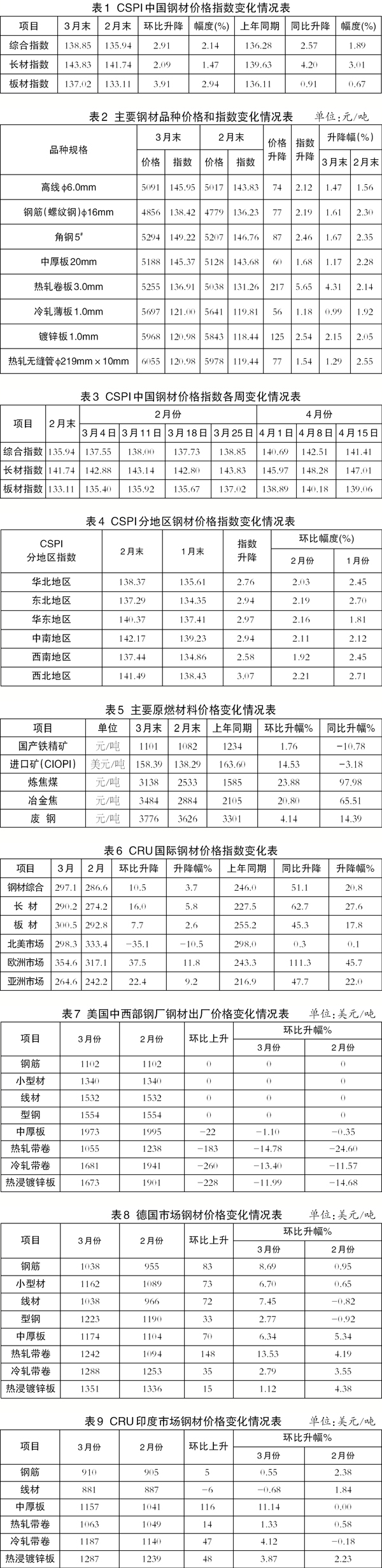 3月末,CSPI長材指數為143.83點,環比上升2.09點,升幅為1.47%;CSPI板材指數為137.02點,環比上升3.91點,升幅為2.94%。長材、板材指數分別同比上升4.20點和0.91點,升幅分別為3.01%和0.67%。(見圖2、表1)
