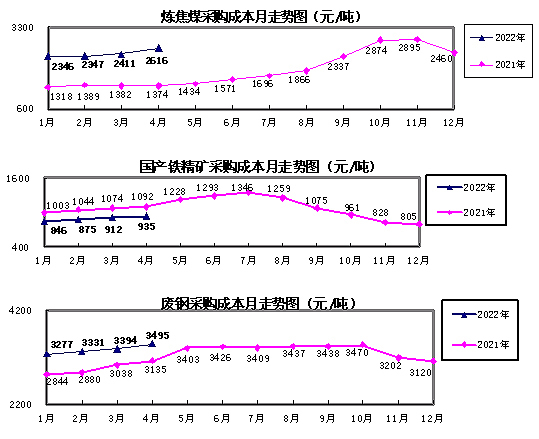 4月份,煤焦和鐵礦石、廢鋼采購成本繼續上升。