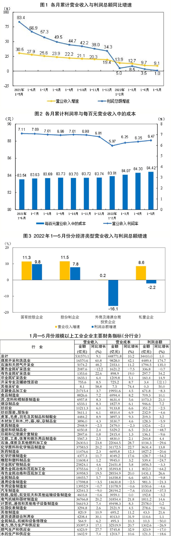 1月—5月份,采礦業實現利潤總額7082.7億元,同比增長1.31倍;製造業實現利潤總額25579.5億元,下降10.8%;電力、熱力、燃氣及水生產和供應業實現利潤總額1747.9億元,下降24.7%。在41個工業大類行業中,16個行業利潤總額同比增長,24個行業下降,1個行業由虧轉盈。主要行業利潤情況如下:煤炭開采和洗選業利潤總額同比增長1.75倍,石油和天然氣開采業增長1.35倍,有色金屬冶煉和壓延加工業增長26.6%,電氣機械和器材製造業增長14.6%,化學原料和化學製品製造業增長13.8%,計算機、通信和其他電子設備製造業增長0.2%,紡織業下降2.5%,非金屬礦物製品業下降3.3%,專用設備製造業下降4.6%,農副食品加工業下降8.3%,通用設備製造業下降21.3%,電力、熱力生產和供應業下降26.9%,石油、煤炭及其他燃料加工業下降29.6%,汽車製造業下降37.5%,黑色金屬冶煉和壓延加工業下降64.2%。
