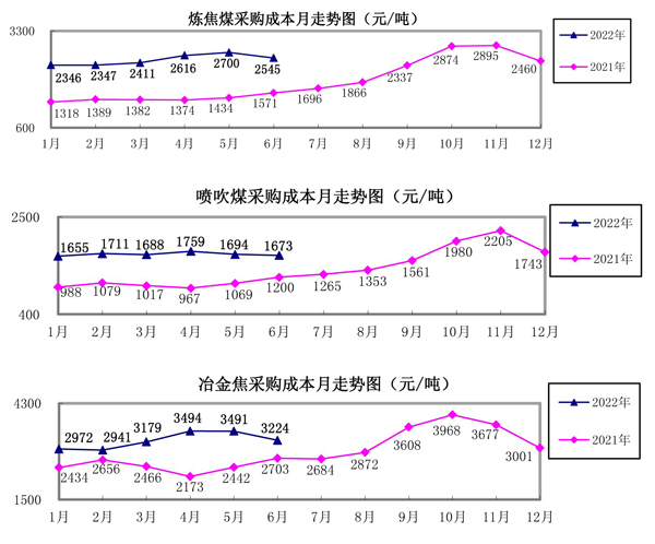 6月份,冶金焦加權平均折算成幹基的采購成本3223.84元/噸,環比下降266.68元/噸,降幅為7.64%。1月—6月份累計平均折算成幹基的采購成本為3212.35元/噸,同比升高726.70元/噸,升幅為29.24%。