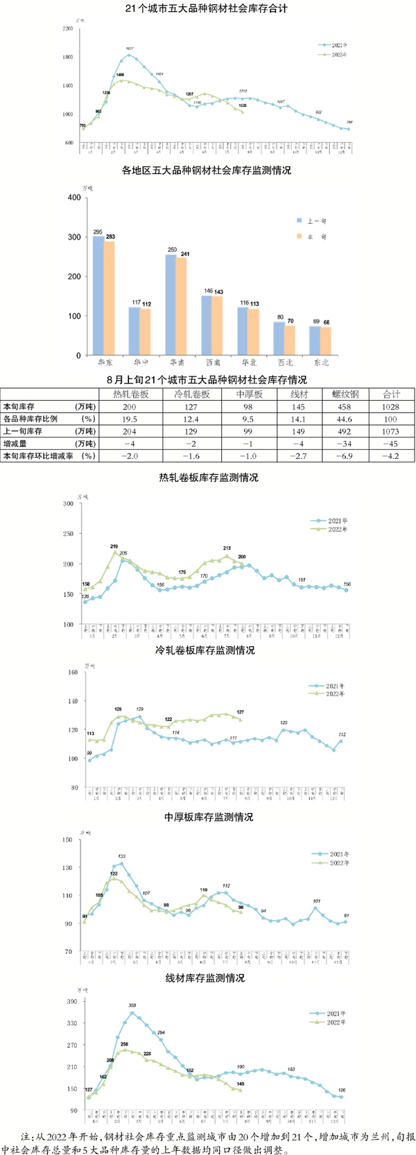 8月上旬,21個城市五大品種鋼材社會庫存為1028萬噸,環比減少45萬噸,下降4.2%,繼續呈現下降趨勢;比今年初增加240萬噸,上升30.5%;比去年同期減少185萬噸,下降15.2%。