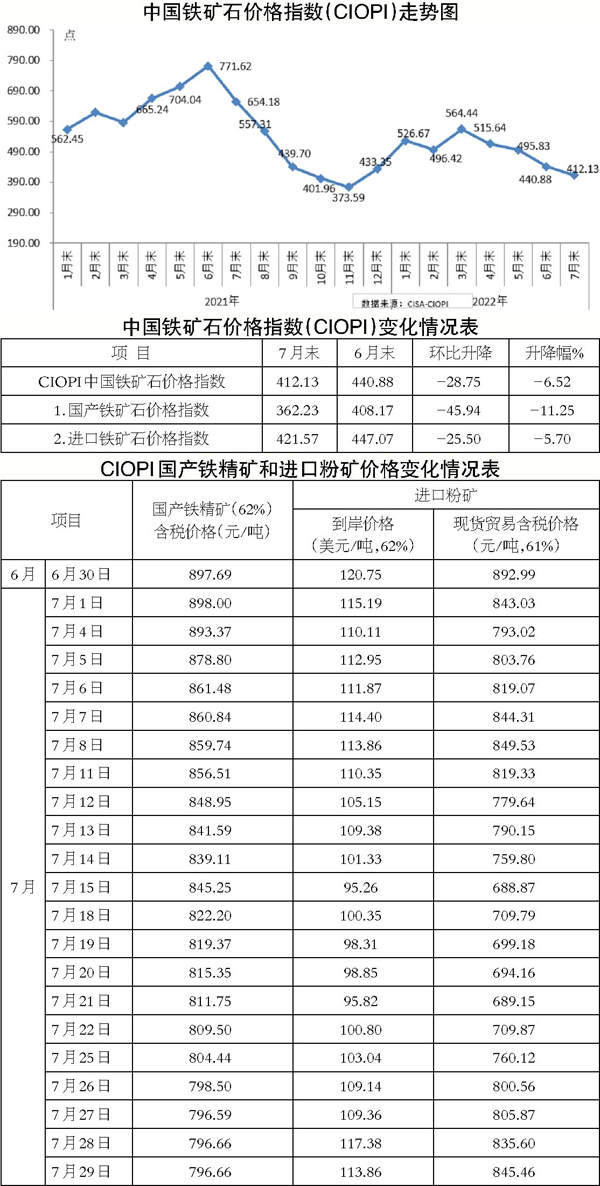 據鋼協監測,7月末,中國鐵礦石價格指數(CIOPI)為412.13點,環比下降28.75點,降幅為6.52%,較6月收窄4.56個百分點;同比下降242.5點,降幅為37.00%。