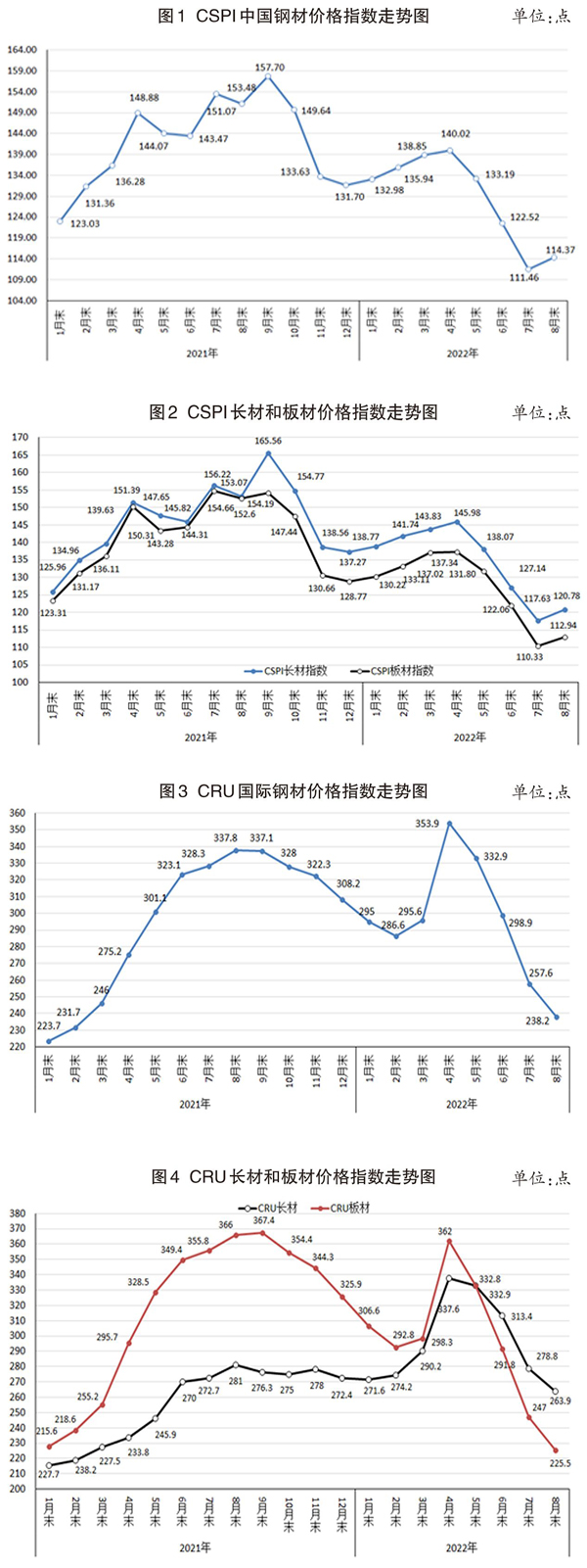 據中國鋼鐵工業協會監測,8月末,中國鋼材價格指數(CSPI)為114.37點,環比回升2.91點,升幅為2.61%,連續第3個月環比下降後首次回升;同比下降36.70點,降幅為24.29%,連續第5個月低於去年同月。(見圖1)