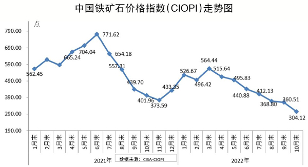 據鋼協監測,10月末,中國鐵礦石價格指數(CIOPI)為304.12點,環比下降56.39點,降幅為15.64%,較9月份擴大13.39個百分點;同比下降97.84點,降幅為24.34%。