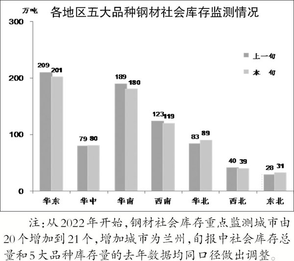 11月下旬,分地區來看,七大區域鋼材社會庫存環比各有升降,具體情況為:華南地區環比減少9萬噸,下降4.8%,為減量和降幅最大地區;華東地區減少8萬噸,下降3.8%;西南地區減少4萬噸,下降3.3%;西北地區減少1萬噸,下降2.5%;華北地區庫存環比增加6萬噸,上升7.2%,為增量最大地區;東北地區增加3萬噸,上升10.7%,為升幅最大地區;華中地區增加1萬噸,上升1.3%。