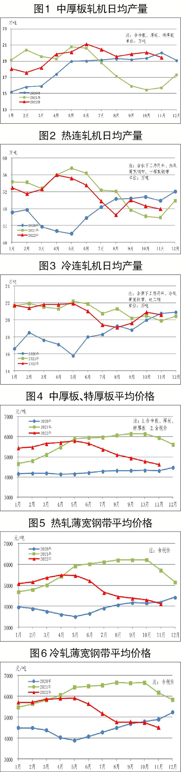 2022年11月份,中厚板軋機、熱連軋機和冷連軋機產量環比下降、同比上升。主要品種板中造船板、橋梁板、管線鋼板和汽車板產量同比連續快速增長,集裝箱板和家電板產量同比繼續大幅下滑。
