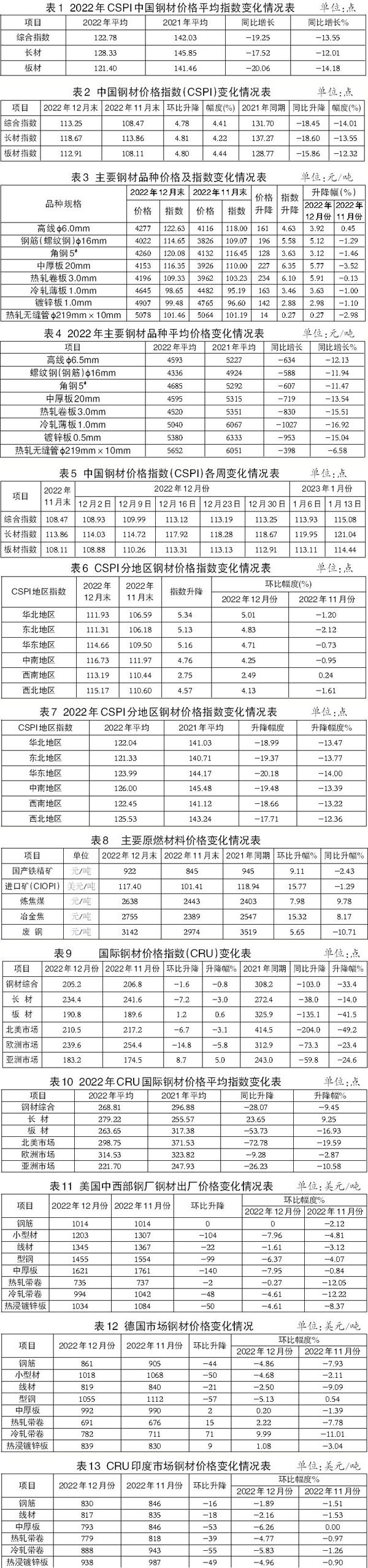 從2022年全年情況看,2022年CRU國內鋼材價格平均指數為268.81點,同比下降28.07點,降幅為9.45%。