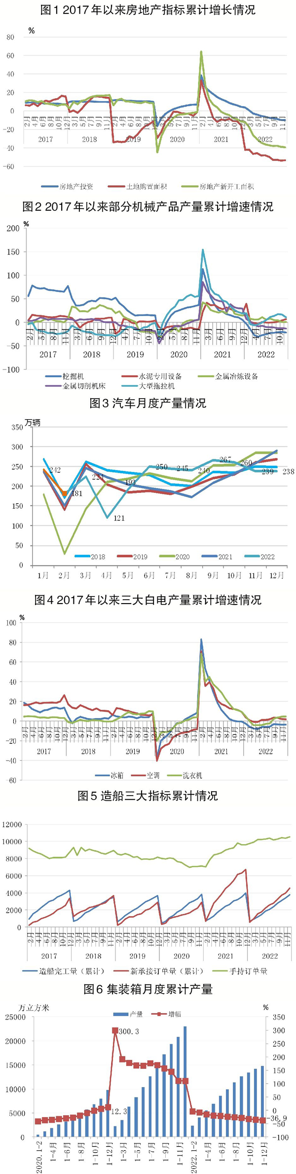 2022年,主要用鋼行業運行總體呈下行態勢。建築業呈現分化態勢,其中房地產主要指標繼續下降,基礎設施建設投資保持較快增長。2022年,製造業總體運行穩定。其中,機械行業工業增加值保持增長,但機電產品出口額增幅持續收窄;汽車行業保持增長,在新能源汽車和出口市場方麵表現亮眼;船舶行業總體平穩向好,手持訂單量持續增長;家電行業三大白電(空調、洗衣機、冰箱)產量兩升一降;集裝箱產量及出口量大幅回落。