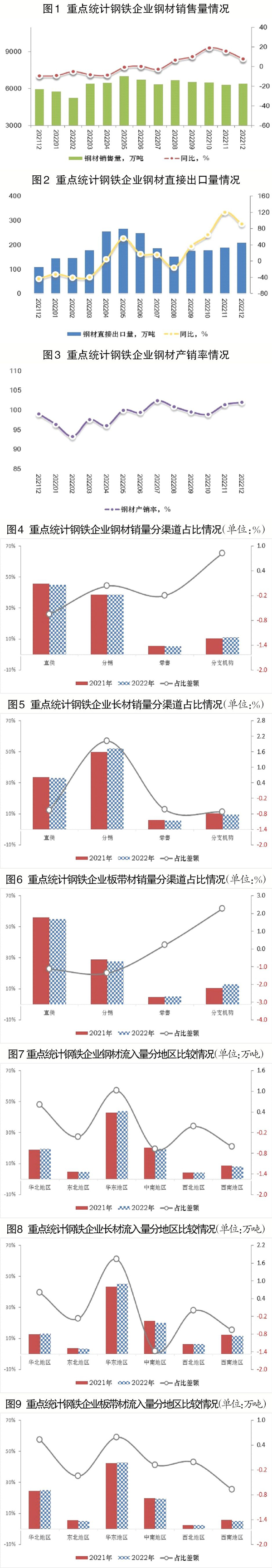 上述統計數據表明:2022年12月份,需求收縮、供給衝擊、預期轉弱“三重壓力”依然較大,對工業經濟平穩運行影響明顯,但隨著穩經濟一攬子政策和接續政策措施落地顯效,企業生產經營保持穩定,2022年12月份鋼材銷售量同比上升、日銷量環比小幅下降;麵對世界經濟下行壓力加大、全球貿易動能轉弱,我國積極擴大開放,外貿發展韌性彰顯,2022年12月份鋼材直接出口量環比、同比繼續上升;廣大會員鋼鐵企業對新市場環境的適應性持續增強,積極采取的各類應對措施更加有效,堅持“三定三不要”經營原則,堅持按合同組織生產,鋼材產銷率環比上升,保持在100%以上。但市場需求的階段性、jijiexing,yijiwaibuhuanjingdongdangheyiqingchongjidengbuquedingxingyinsuyirancunzai,gangtieqiyeshengchanjingyingyiranmianlinjiaoduokunnanhetiaozhan,gangtiegongxubianhuarengxumiqiegenzongheguanzhu,gongtongweihugangtiexingyepingwenyunxing。