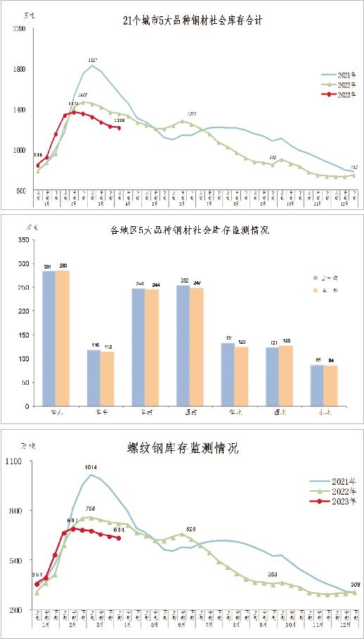 4月上旬,5大品種鋼材社會庫存環比各有升降,其中螺紋鋼為減量最大品種。熱軋卷板庫存為183萬噸,環比增加3萬噸,上升1.7%,庫存連續4旬下降後小幅回上升;比今年初增加26萬噸,上升16.6%;比去年同期減少3萬噸,下降1.6%。冷軋卷板庫存為131萬噸,環比減少1萬噸,下降0.8%,庫存變化不大;比今年初增加18萬噸,上升15.9%;比去年同期增加8萬噸,上升6.5%。中厚板庫存為101萬噸,環比持平;比今年初增加7萬噸,上升7.4%;比去年同期增加2萬噸,上升2.0%。線材庫存為169萬噸,環比減少5萬噸,下降2.9%,庫存連續小幅下降;比今年初增加89萬噸,上升111.3%;比去年同期減少57萬噸,下降25.2%。螺紋鋼庫存為634萬噸,環比減少10萬噸,下降1.6%,庫存降幅收窄;比今年初增加326萬噸,上升105.8%;比去年同期減少88萬噸,下降12.2%。
