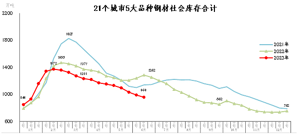 6月中旬,21個城市5大品種鋼材社會庫存為956萬噸,環比減少33萬噸,下降3.3%,庫存繼續下降;比今年初增加204萬噸,上升27.1%;比去年同期減少329萬噸,下降25.6%。