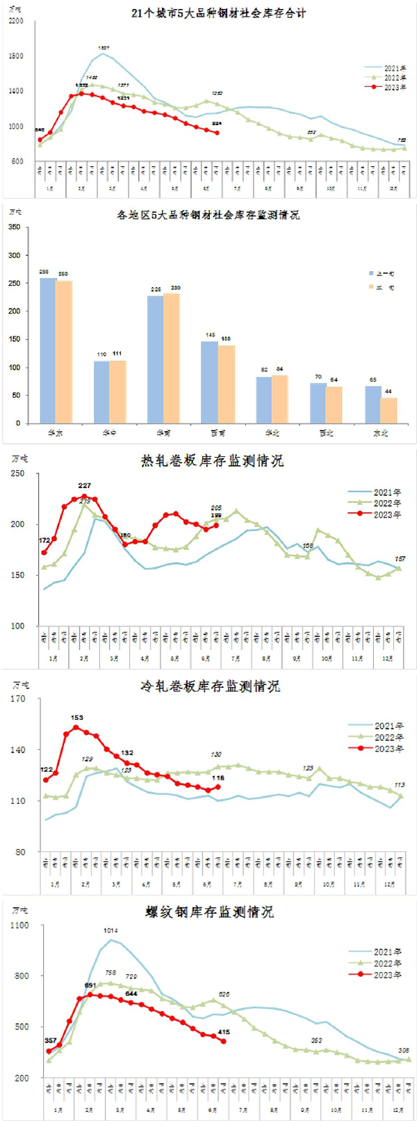 6月下旬,5大(da)品(pin)種(zhong)鋼(gang)材(cai)社(she)會(hui)庫(ku)存(cun)環(huan)比(bi)來(lai)看(kan),長(chang)材(cai)品(pin)種(zhong)庫(ku)存(cun)下(xia)降(jiang),板(ban)材(cai)品(pin)種(zhong)上(shang)升(sheng)。其(qi)中(zhong),螺(luo)紋(wen)鋼(gang)為(wei)減(jian)量(liang)最(zui)大(da)品(pin)種(zhong),線(xian)材(cai)為(wei)降(jiang)幅(fu)最(zui)大(da)品(pin)種(zhong),板(ban)材(cai)庫(ku)存(cun)環(huan)比(bi)均(jun)有(you)小(xiao)幅(fu)上(shang)升(sheng)。熱(re)軋(zha)卷(juan)板(ban)庫(ku)存(cun)為(wei)199萬噸,環比增加4萬噸,上升2.1%,庫存由降轉升;比5月下旬減少5萬噸,下降1.5%;比今年初增加42萬噸,上升26.8%;比上年同期減少6萬噸,下降2.9%。冷軋卷板庫存為118萬噸,環比增加2萬噸,上升1.7%,庫存連續下降後小幅回升;比5月下旬減少1萬噸,下降0.8%;比今年初增加5萬噸,上升4.4%;比上年同期減少12萬噸,下降9.2%。中厚板庫存為95萬噸,環比增加3萬噸,上升3.3%,庫存小幅波動;與5月下旬庫存持平;比今年初增加1萬噸,上升1.1%;比上年同期減少12萬噸,下降11.2%。線材庫存為97萬噸,環比減少12萬噸,下降11.0%,庫存連續下降;比5月下旬減少29萬噸,下降23.0%;比今年初增加17萬噸,上升21.3%;比上年同期減少87萬噸,下降47.3%。螺紋鋼庫存為415萬噸,環比減少29萬噸,下降6.5%,庫存降幅擴大;比5月下旬減少74萬噸,下降15.1%;比今年初增加107萬噸,上升34.7%;比上年同期減少211萬噸,下降33.7%。