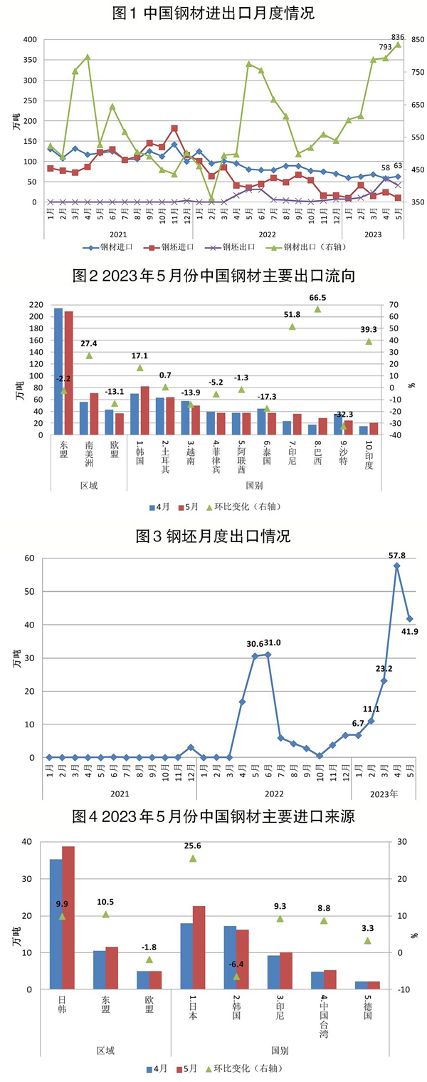 5月份,我國向東盟出口鋼材209.0萬噸,環比減少2.2%。其中,對泰國、越南出口環比分別下降17.3%和13.9%;而對印尼出口大幅回升51.8%至36.1萬噸,為近兩年最高水平。對南美洲出口70.8萬噸,環比增長27.4%,增量主要來自對巴西出口,環比大幅增長66.5%至28.3萬噸。在主要出口目的地中,對韓國出口環比增長12.0萬噸至82.1萬噸,對巴基斯坦出口環比增長12.0萬噸至20.2萬噸。