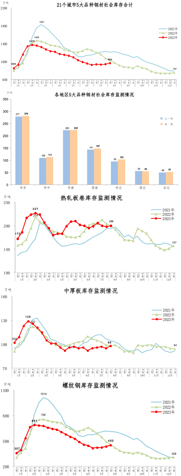 8月上旬,21個城市5大品種鋼材社會庫存為964萬噸,環比增加23萬噸,上升2.4%,庫存連續小幅上升;比今年初增加212萬噸,上升28.2%;比去年同期減少64萬噸,下降6.2%。