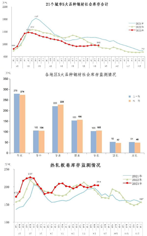 8月下旬,分地區來看,7大區域鋼材社會庫存各有升降,具體情況為:華南地區環比增加8萬噸,上升3.6%,為增量、升幅最大地區;西南地區增加3萬噸,上升2.0%;華北增加2萬噸,上升1.9%;西北地區環比減少5萬噸,下降9.6%,為降幅最大地區;華東地區減少5萬噸,下降1.8%;東北地區減少3萬噸,下降5.9%;華中地區減少1萬噸,下降1.0%。