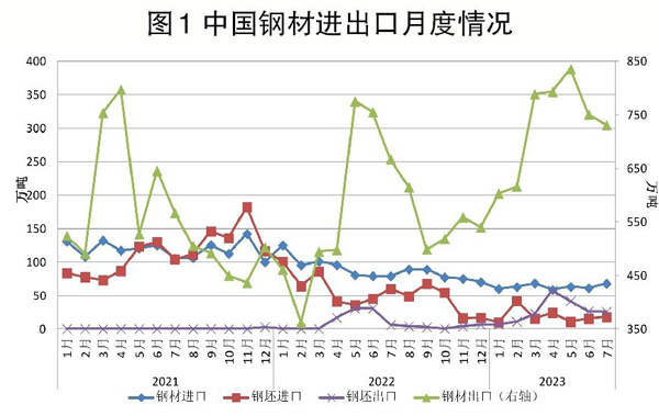 1月—7月份,我國進口鋼材441.9萬噸,同比減少32.6%;進口平均單價為1699.8美元/噸,同比上漲7.7%;進口鋼坯135.7萬噸,同比下降68.7%。我國出口鋼材5089.2萬噸,同比增長27.9%;出口平均單價為1045.2美元/噸,同比下跌28.1%;出口鋼坯193.3萬噸,同比增加108.6萬噸;粗鋼淨出口4906.8萬噸,同比增長1790.1萬噸,增幅57.4%。