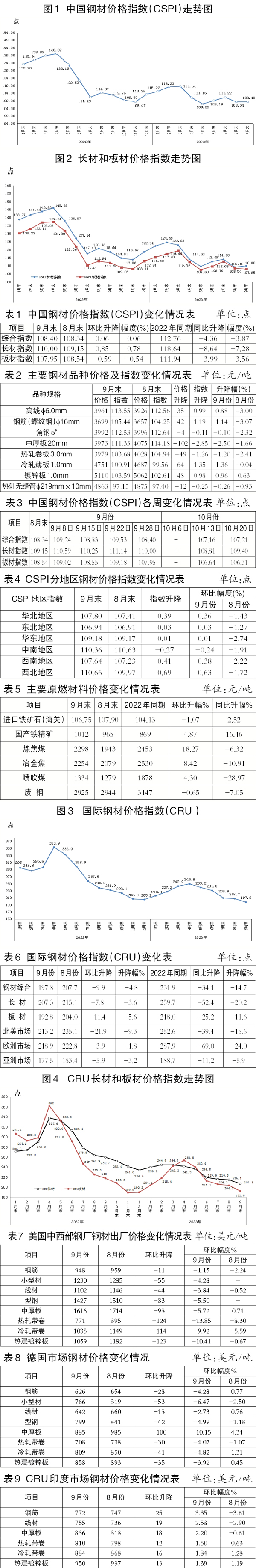 9月份,CSPI國內鋼材綜合指數呈波動下行走勢,第一周、第三周上升,第二周、第四周下降。進入10月份以來,鋼價呈止跌趨穩走勢。