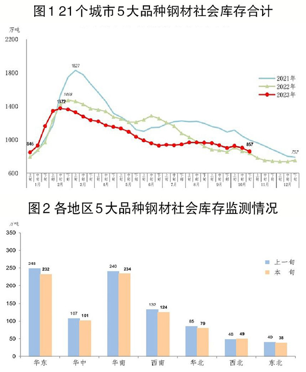 10月下旬,21個城市5大品種鋼材社會庫存為857萬噸,環比減少43萬噸,下降4.8%,庫存降幅擴大;比9月下旬減少39萬噸,下降4.4%;比今年初增加105萬噸,上升14.0%;比去年同期增加21萬噸,上升2.5%。