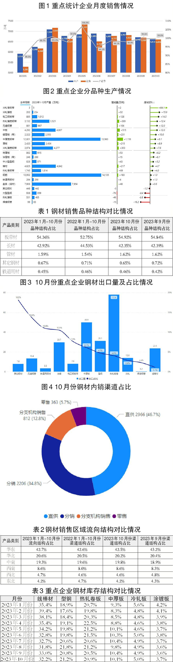 10月份,重點企業內銷鋼材量為6348萬噸,內銷占比為96.1%。其中,通過直供渠道、分銷渠道、分支機構銷售渠道、零售渠道的占比分別為46.7%、34.8%、12.8%、5.7%。