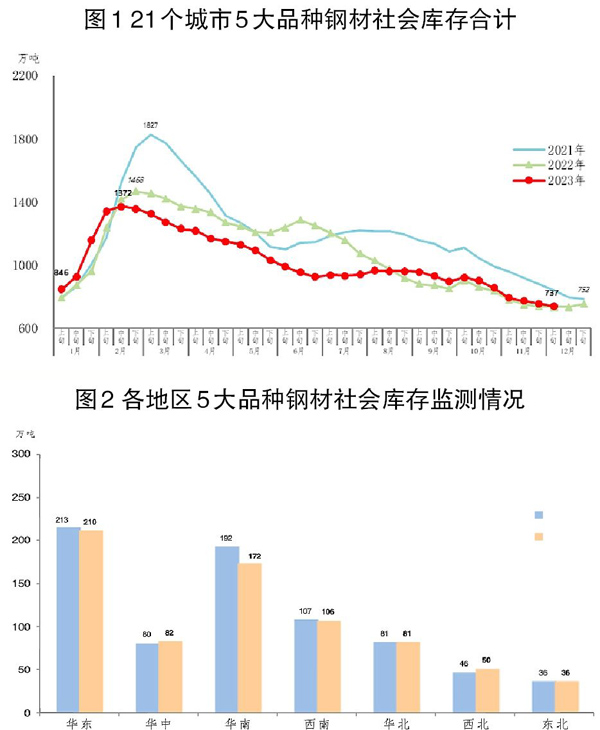 12月上旬,21個城市5大品種鋼材社會庫存為737萬噸,環比減少18萬噸,下降2.4%,庫存延續小幅下降走勢;比今年初減少15萬噸,下降2.0%;比去年同期增加2萬噸,上升0.3%。