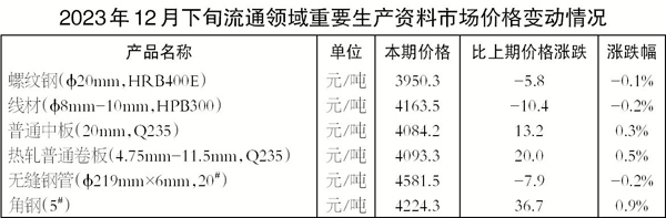 2023年12月下旬,φ20毫米HRB400E螺紋鋼的價格為3950.3元/噸,環比下跌5.8%,跌幅為0.1%;φ8毫米~φ10毫米HPB300線材價格為4163.5元/噸,環比下跌10.4%,跌幅為0.2%;20毫米Q235普通中板價格為4084.2元/噸,環比上漲13.2%,漲幅為0.3%;4.75毫米~11.5毫米Q235熱軋普通卷板的價格為4093.3元/噸,環比上漲20.0元/噸,漲幅為0.5%;φ219毫米×6毫米20#無縫鋼管的價格為4581.5元/噸,環比下跌7.9%,降幅為0.2%;5#角鋼的價格為4224.3元/噸,環比上漲36.7%,漲幅為0.9%。 (郭同炬)